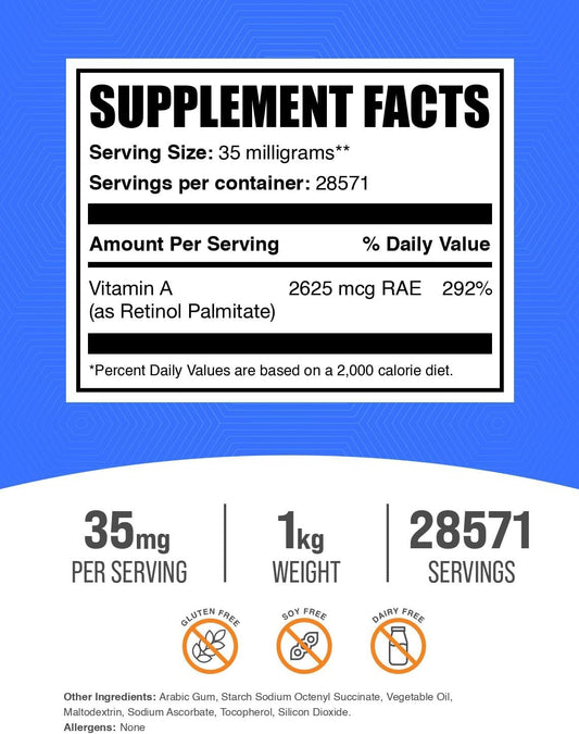 Vitamin A Palmitate Powder 35mg - Immune & Eye Support Supplement - Gluten Free - 1kg (2.2 lbs) - Pack of 1