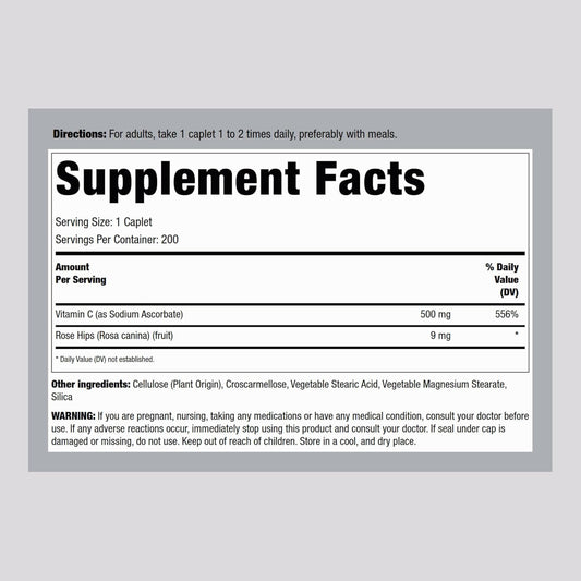 500mg Vitamin C Caplets with Rose HIPS | 200 Count | Vegetarian, Non-GMO, Gluten Free