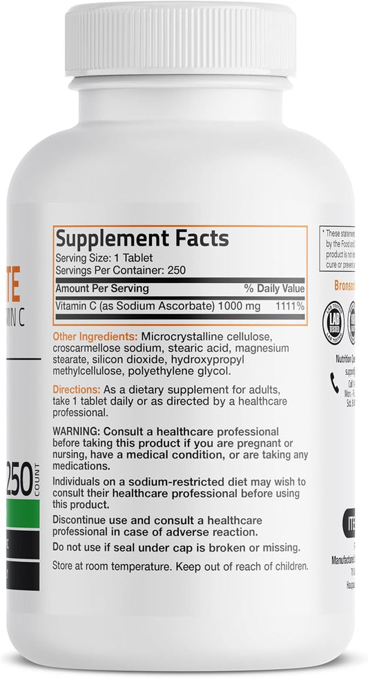 Bronson Non Acidic Vitamin C Tablets 1000mg - Gentle on Stomach - Immune System Booster - Antioxidant - Non GMO - 250 Count