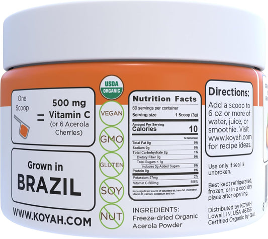 KOYAH Organic Acerola Powder: Freeze-Dried 500mg Vitamin C, Non-GMO Vegan Whole-Food Supplement