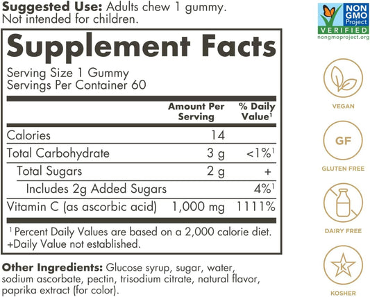 Solgar 1000mg Ultra Potency Vitamin C Gummies for Adults - Immune Support, Tart Orange Flavor, Vegan & Gluten Free - 2 Month Supply