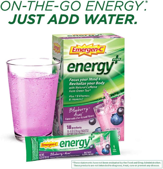 Emergen-C Energy+ Blueberry Acai Drink Mix - B Vitamins, Vitamin C, Natural Caffeine - Pack of 18 Powder Packets