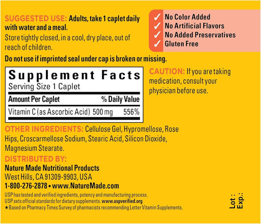 130 Count Nature Made Vitamin C 500 mg Caplets with Rose Hips for Immune Support