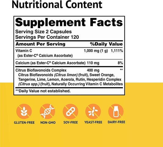American Health Ester-C 500 mg Capsules with Citrus Bioflavonoids - 120 Count - 24-Hour Immune Boost - Non-GMO, Vegan, Gluten Free - 60 Servings