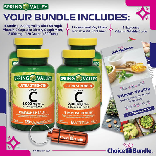 Spring Valley Ultra Strength Vitamin C Capsules 2,000 mg 120 Ct 4 pk Bundle with Vitamin Guide & Pill Container (480 Total)