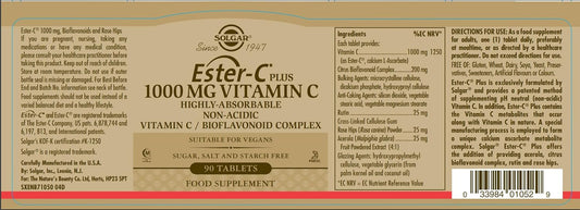 Solgar Ester-C Plus 1000mg Vitamin C Tablets - Non-Acidic Antioxidant & Immune System Support - Gentle On Stomach - Vegan, Non GMO - 90 Servings