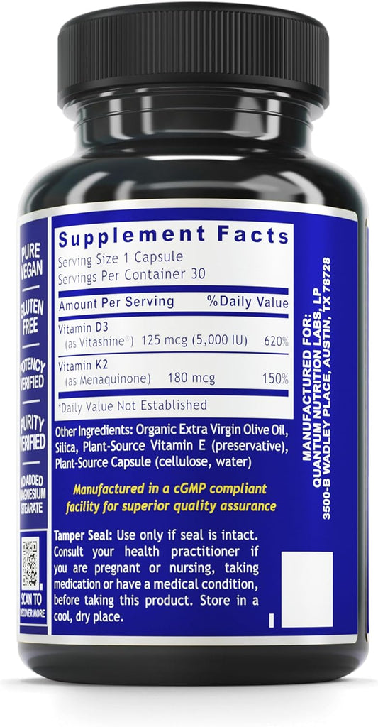 Plant-Based Quantum Vitamin D3 & K2 Capsules for Bone and Cardiovascular Health - Vegan Formula for Calcium Metabolism, Blood Circulation, and Bone Strength - 30 Count
