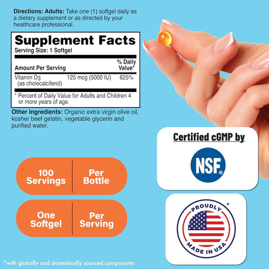Vitamin D3 5,000iu Softgels for Immune Health | 125mcg Cholecalciferol | Non-GMO Organic EVOO