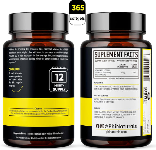 365 Softgel Capsules of PhiNaturals Vitamin D3 1000iu Supplement with Olive Oil Base - One Year Supply of Vitamin D3