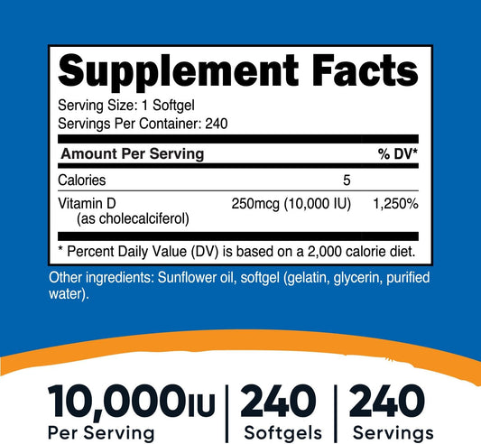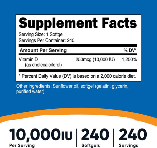 Potent Non-GMO Vitamin D3 10,000 IU Supplement, 240 Softgel Capsules - Gluten Free Formula by Nutricost