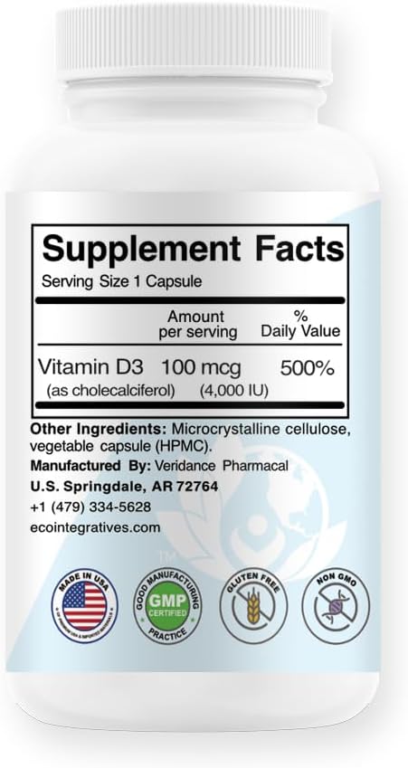 EcoIntegratives D3 4,000 IU Supplement for Muscle, Bone, Teeth, Breast, Prostate, Heart, Gut, & Immune Health - 120 Veg Caps