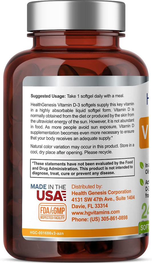 240 Softgels of Health Genesis Vitamin D-3 2000 IU with Extra Virgin Olive Oil - Non-GMO and Soy-Free
