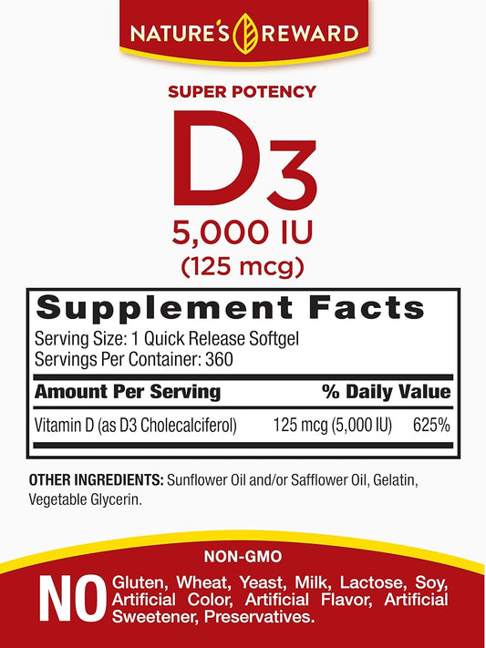 Nature's Reward Vitamin D3-5000 IU Softgels - 360 Count, Non-GMO, Gluten Free Supplement