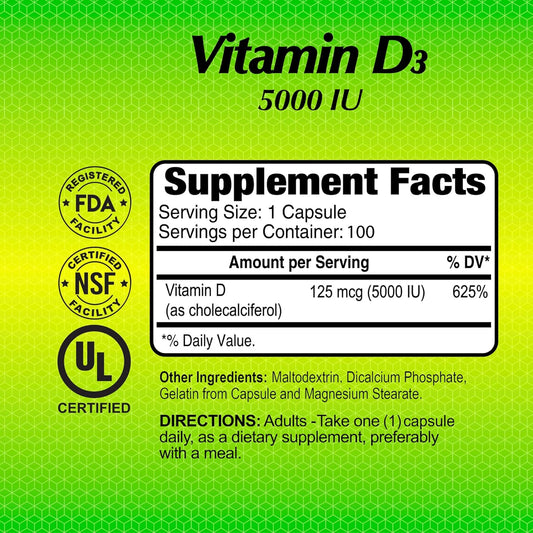 Vitamin D3 5000 IU Capsules for Immune Support, Joint Health, and Strong Bones - 100 Count
