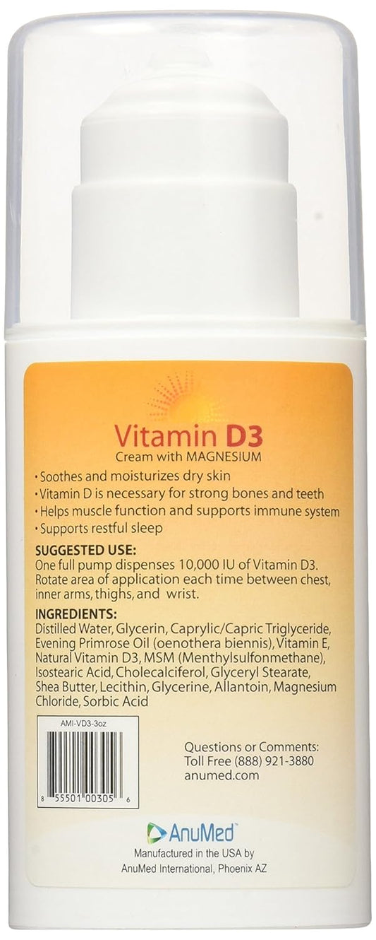 ANUMED Vitamin D3 10,000 IU Cream with Magnesium, Hyaluronic Acid, Vitamin E - Skin Care for Stronger Bones, Muscles, Joints, Heart, Immune System - Non-Greasy 3oz