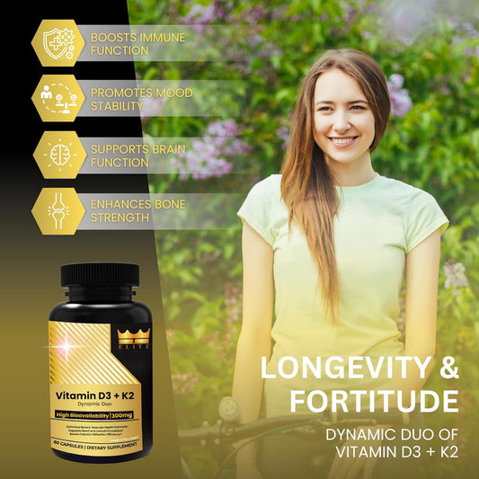 Crown Elite Premium Vitamin D3 & K2 Supplement 5000 IU & 100 mcg | Heart & Immune Support Vegan Capsules | Non-GMO, Organic