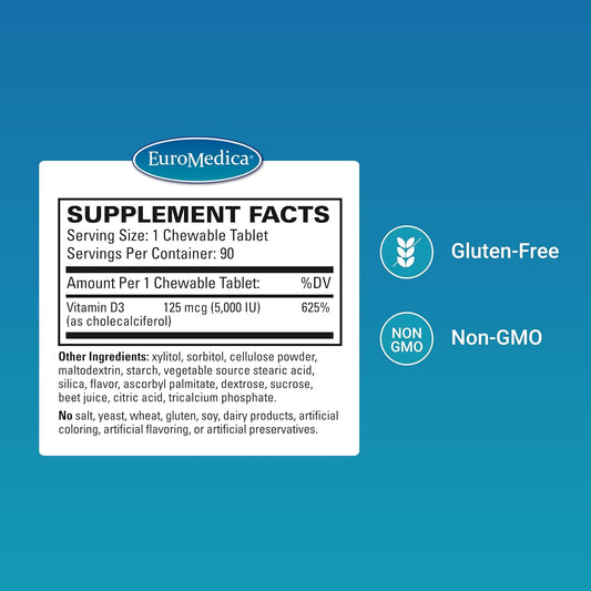 Euromedica Vitamin D3 5000 IU Chewable Tablets - Mixed Berry Flavor - Supports Bone Health, Immune System - 90 Servings