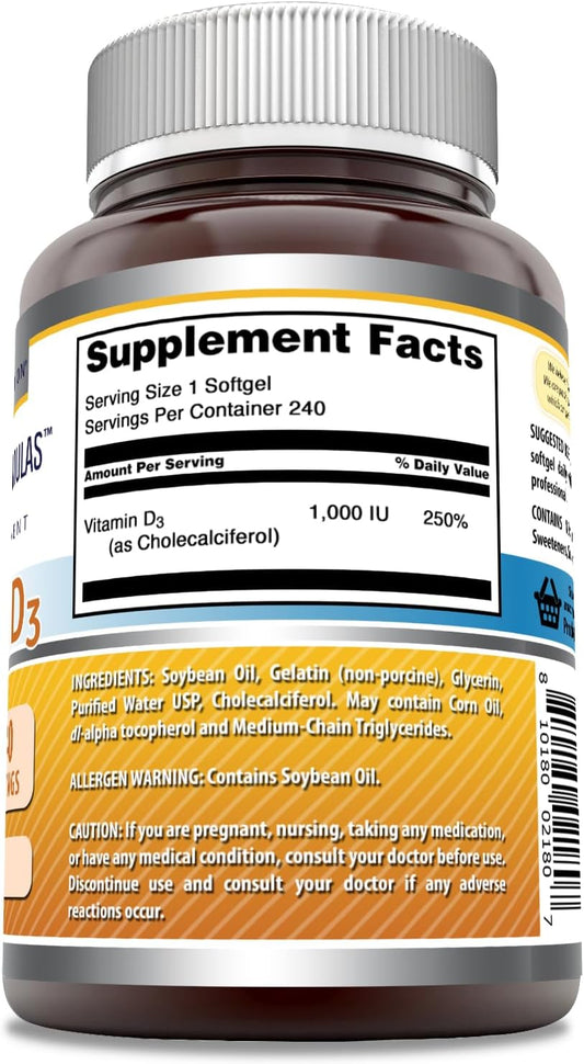High Quality Vitamin D3 Supplement - 1000 IU - 240 Softgels - Non-GMO & Gluten Free - Made in USA by Amazing Nutrition