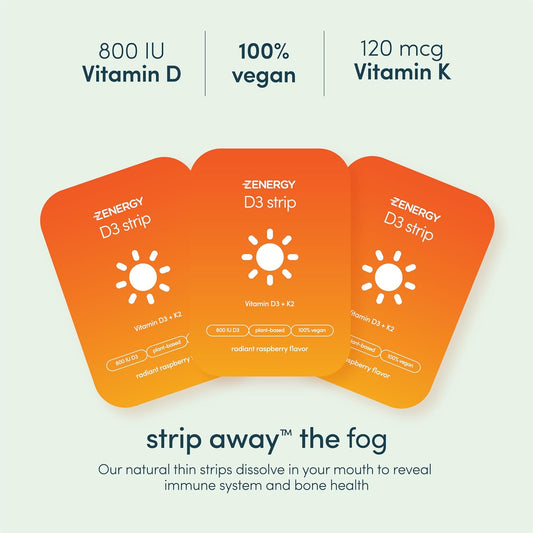 Vegan Raspberry ZENERGY D3 Oral Strips with Vitamin K - 800 IU D3 + 120mcg | Plant-Based Instant Action Supplement - 30 Strips