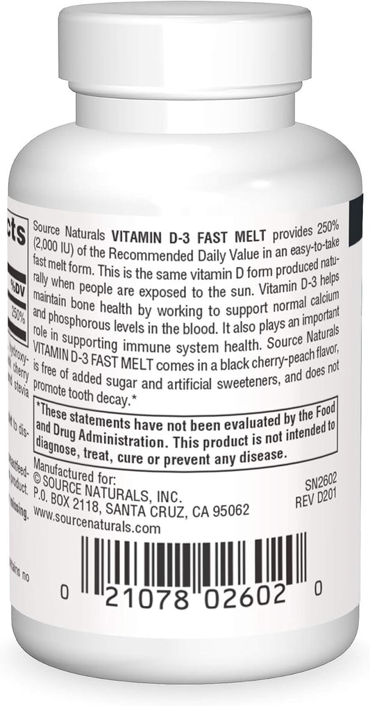 Vitamin D-3 2000 iu Fast Melt Tablets for Bone & Immune Health - Black Cherry Peach Flavor - 60 Tablets by Source Naturals