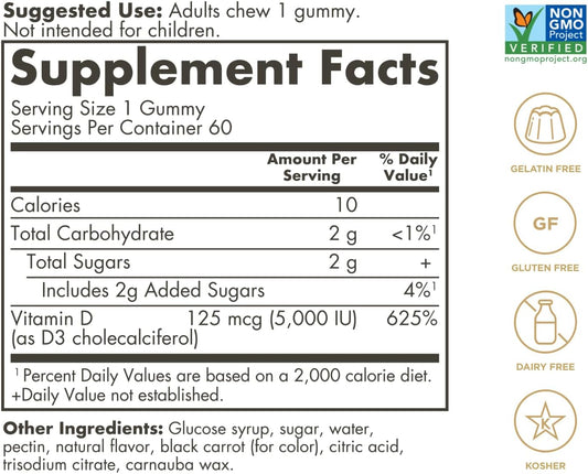 Solgar Vitamin D3 Gummies 5000IU for Adults - Immune System Support - Strawberry Flavor - Gluten & Gelatin Free - 2 Month Supply