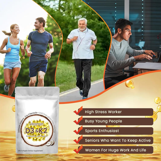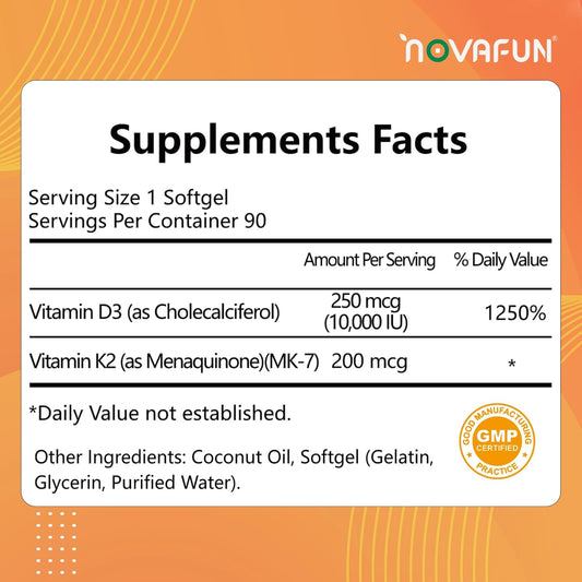 180 Softgel Podafu 2-in-1 Vitamin D3 K2 Supplement, 10000 IU VIT D3 + 200 MCG K2, GMO-Free for Enhanced Calcium Absorption