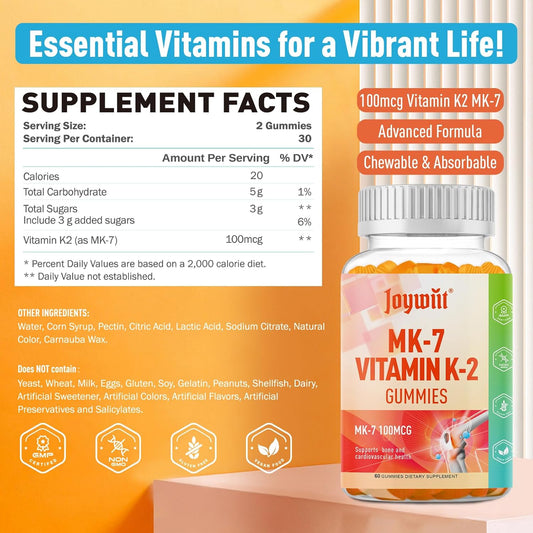 Extra Strength Vitamin K2 MK-7 Gummies for Bone & Heart Support - Natural Orange Flavor, Non GMO, Vegan - 60 Gummies