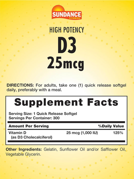 300 Softgels of Sundance High Potency Vitamin D3 1000 IU Formula | Non-GMO & Gluten Free