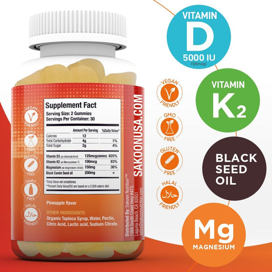 Sakoon Nutrition Vitamin D3 K2 Gummy Supplement with Black Seed Oil for Bone, Muscle, Immune Support - Non-GMO, Gluten Free - 60 Chewables