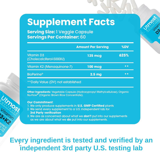 Vitamin D3 with K2 Supplement - 5000iu D + 100mcg K for Maximum Bioavailability - Supports Cardiovascular, Immune, and Bone Health - 60 Capsules