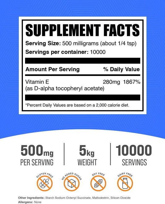 BulkSupplements.com D-Alpha Tocopherol Vitamin E Powder 400 IU - Gluten Free, 500mg per Serving, 5kg (11 lbs), Pack of 5Vendor:BulkSupplementsRegular price $944.82 AUDRegular priceUnit price / per-