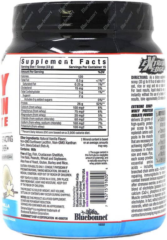 Bluebonnet Nutrition Extreme Edge Vanilla Whey Protein Isolate Powder - Grass Fed, 26g Protein, Non GMO, Gluten Free, Kosher Dairy - 1lb