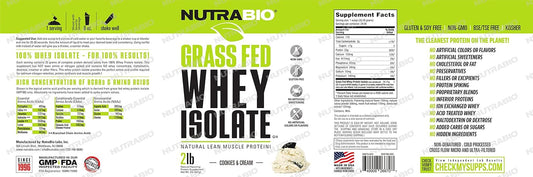 NutraBio Grass Fed Whey Isolate Protein Powder - Cookies & Cream Flavor - 25G Protein Per Scoop - 2lb, 29 Servings - Sugar-Free Lean Muscle Supplement