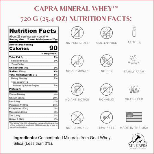Mt. Capra Mineral Whey Powder Supplement - Rich in Potassium, Alkalizing, Bio-Available, from Goat Milk Whey - 25.4 oz, 28 Servings