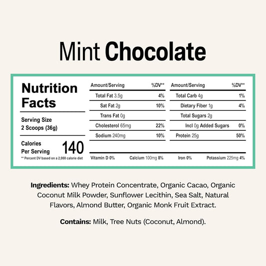 Organic Mint Chocolate Grass-Fed Whey Protein Powder - 25g Protein, No Artificial Ingredients - Sugar-Free, Gluten-Free, Soy-Free - 2.4 lbs