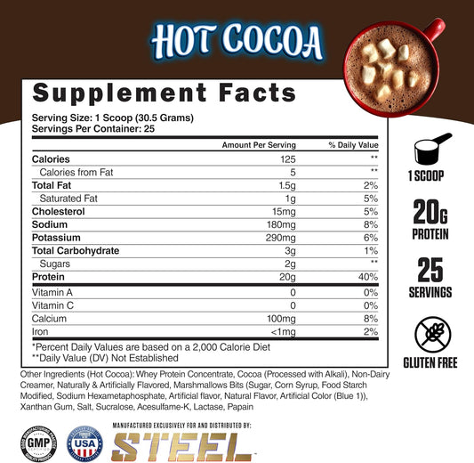 Steel Supplements Whey-Pro Hot Cocoa Protein Powder - 100% Pure Whey for Muscle Gain & Recovery - Gluten Free, Non-GMO - BCAA 5g - 1.69 lbs, 25 Servings
