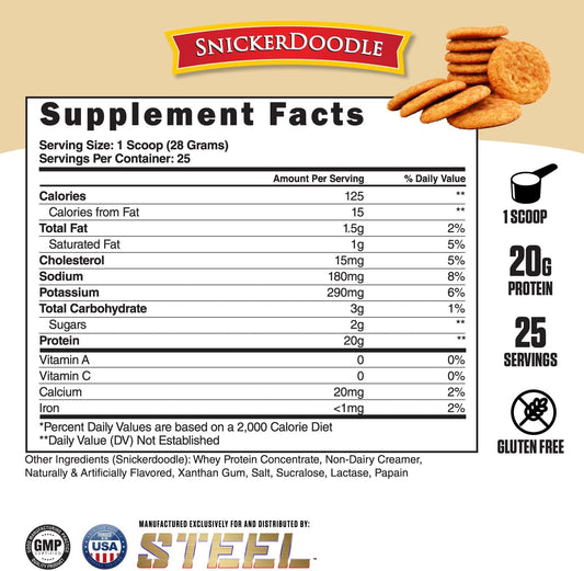 Steel Supplements Whey-Pro Snickerdoodle Protein Powder for Muscle Gain and Recovery, 1.65 lbs, Gluten-Free, BCAA 5g, Non-GMO - 25 Servings