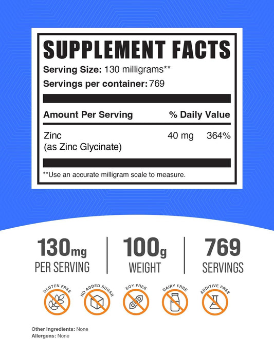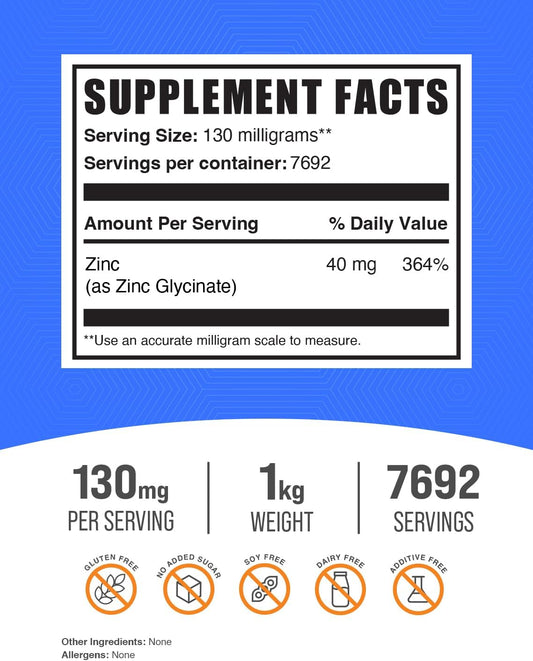 Zinc Glycinate Powder Supplement - Immune Support, 40mg Zinc, Gluten Free, 130mg per Serving, 1kg - Bulk SizeVendor:BulkSupplementsRegular price $143.82 AUDRegular priceUnit price / per-