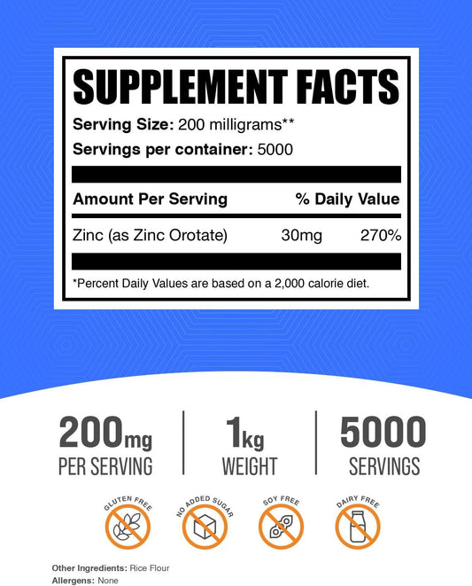 BulkSupplements.com Zinc Orotate Powder - Zinc Supplements for Immune Support - Gluten Free - 1kg (2.2 lbs) - 200mg per Serving - Pack of 1Vendor:BulkSupplementsRegular price $259.77 AUDRegular priceUnit price / per-