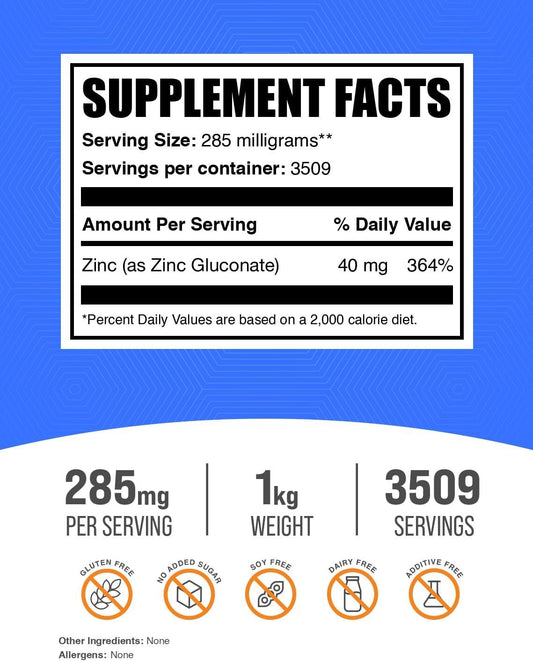 High-Quality Zinc Gluconate Powder - 40mg of Zinc for Immune Health - Gluten-Free, 285mg per Serving, 1kg (2.2 lbs) - BulkSupplementsVendor:BulkSupplementsRegular price $143.82 AUDRegular priceUnit price / per-