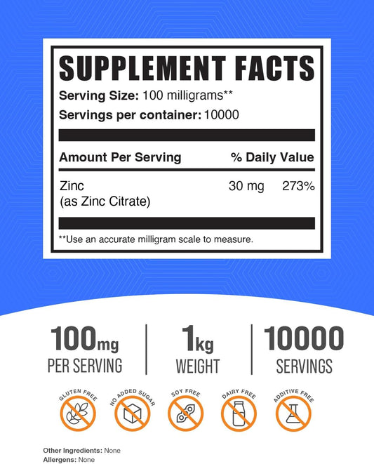 BulkSupplements.com Pure Zinc Citrate Powder - Immune Support Supplement, 30mg Zinc - Gluten Free, 100mg per Serving, 1kg (2.2 lbs) PackVendor:BulkSupplementsRegular price $141.86 AUDRegular priceUnit price / per-