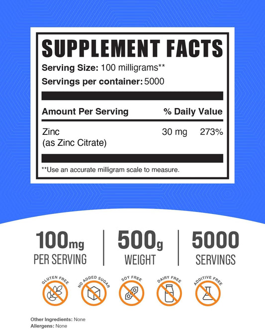 High-Quality 500g Zinc Citrate Powder for Immune Support - Gluten-Free, 30mg Zinc Supplements - Pure Zinc Citrate, 1.1 lbs PackVendor:BulkSupplementsRegular price $129.51 AUDRegular priceUnit price / per-