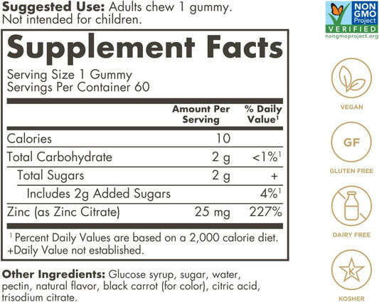 Solgar Zinc Gummies Adult Vitamin with 25mg Ultra Potency Zinc Citrate for Immune Support - Mixed Fruit Flavor, Vegan & Kosher - 60 ServingsVendor:SOLGARRegular price $105.48 AUDRegular priceUnit price / per